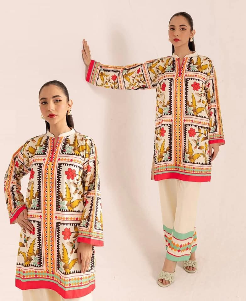 This cord set features a vibrant, traditional-inspired floral and geometric print. The top is a long-sleeved tunic with a round neckline, predominantly in warm yellow, pink, orange, and black tones, decorated with intricate motifs and vertical patterned panels for a slimming effect. The matching wide-leg pants have a black base with scattered floral motifs, bordered with the same patterned design as the top, creating a coordinated and harmonious look. Both pieces are finished with a hot pink edging, adding a bold and lively touch.
